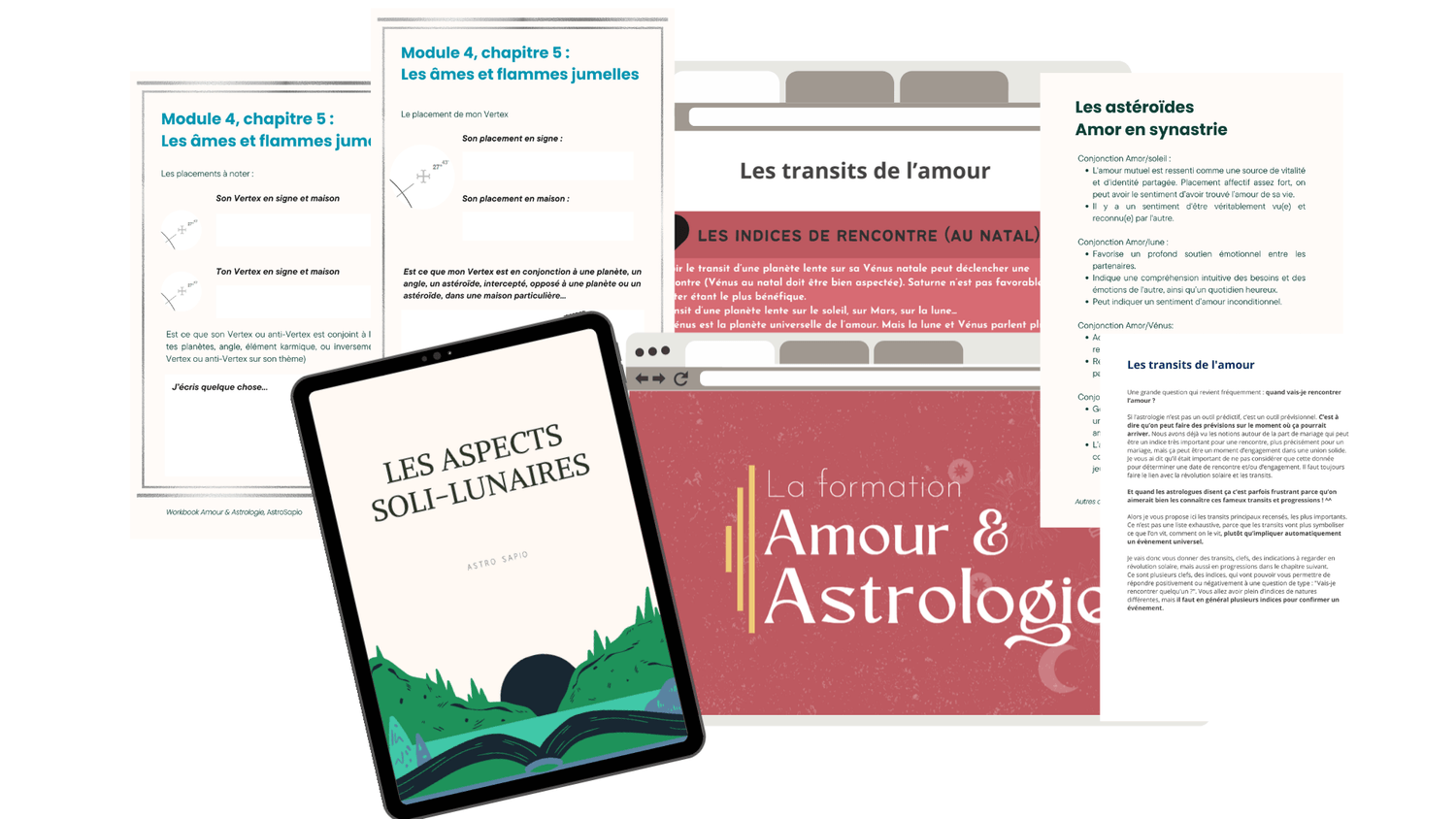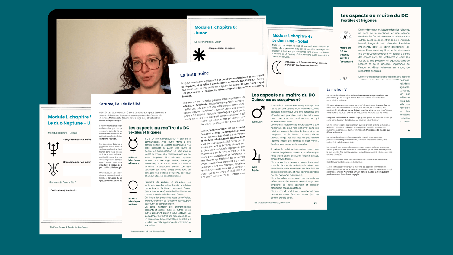 Un work-book de 91 pages : le but de cet outil est que tu puisses dresser, au fil de la formation, ton profil astrologique sur le plan sentimental, de te guider dans tes questionnements personnels concernant tes placements, aspects, configurations. Chaque partie du work-book correspond à un module et un chapitre de la formation, te permettant d'utiliser ce que tu viens d'apprendre et à le mettre en lien avec ton thème à toi. Il est facultatif, mais très utile pour t'aider à réfléchir sur ton thème natal, sur le plan sentimental !