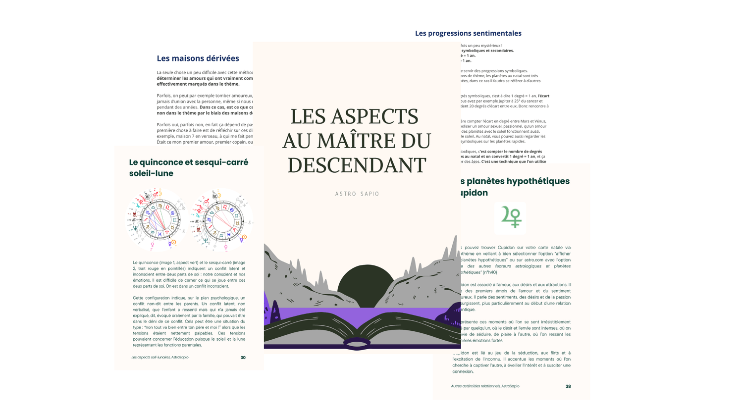 En troisième article bonus : le couple soli-lunaire dans tous les aspects et placements qu'ils peuvent former l'un avec l'autre dans le thème natal, analysés sur le plan sentimental et psychologique, concernant l'image du couple engagé et du couple parental (conjonction, conjonction dissociée, premier et dernier carré, opposition, trigone et sextile, quinconce et sesqui-carré, semi-carré et semi-sextile, signes qui se suivent). 43 pages.
