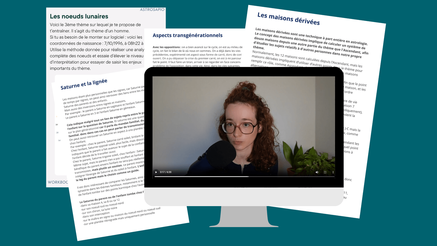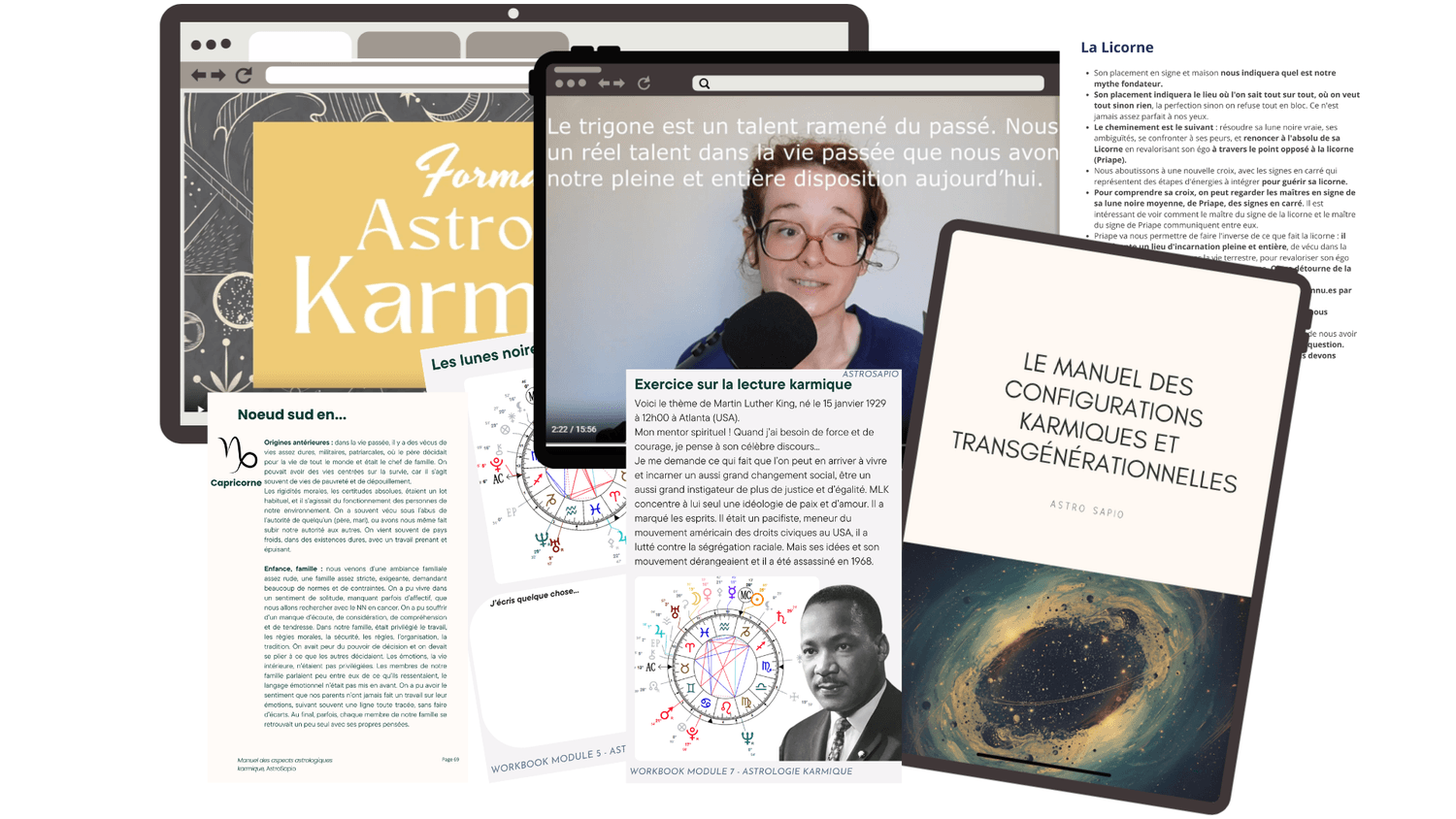La formation est constituée de plus de 25 heures de vidéos, de slides explicatives, d'audios, de partage d'écrans, d'exemples d'analyse, de parties de texte, de pdf, de quiz, et de 7 workbooks (cahiers d'exercice en pdf, 1 par module), ainsi que le "Manuel des aspects karmiques et transgénérationnels" (e-book descriptif sur les placements et aspects karmiques et transgénérationnels).