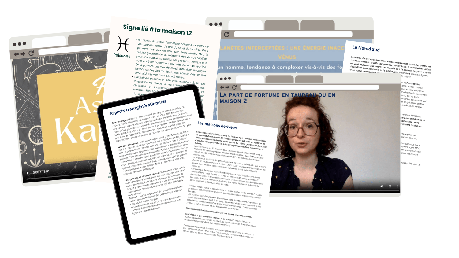 Au module 7 : Tu approfondiras certaines notions, comme Chiron et la part de Fortune, tu apprendras les placements karmiques de Pluton et Saturne, à lire les mémoires des vies passées, à analyser les aspects sous un angle karmique.