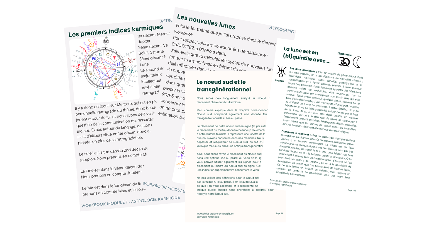 "Le Manuel des aspects karmiques et transgénérationnels" (e-book de 246 pages) décrivant, aspect par aspect, placement par placement, au niveau karmique et transgénérationnel : tous les cas de quinconces et sesqui-carrés, toutes les planètes en quintiles et biquintiles, les aspects Saturne/Pluton dur plan transgéné/karmique, maison 12 & signe de 12, planètes en 12, toutes les planètes en 4 et 8 pour le mythe familial, enfance et tous les Nœuds sud en signe, placement de Saturne, etc...